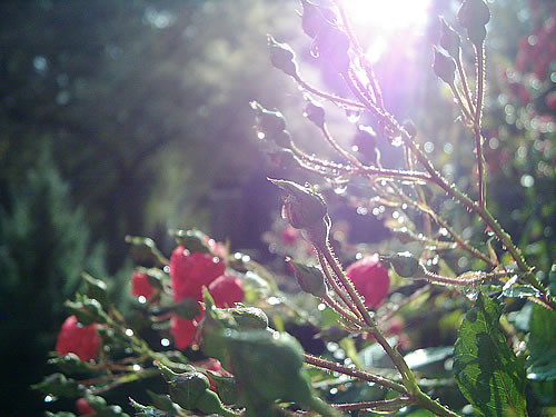 De Sünnenstråhlen sünd lustige Bröder. Se schullen de lütt Roos an't Huus klattern helpen. Een vun jüm sä heemlich to de lüttje Roos: "Also goot! Denn lååt uns fröhlich dien'n Geboortsdag fiern. Ik will di een'n Geboortsdagssöten geven." Dor freu sik de lüttje Klatterroos. Nu keem ok de Wind wedder, tuck dat an denn lütten Rock un froog: