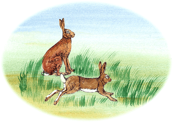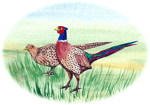 un sien twee Fasanenfruuns hüppt achter em ut de Dünen.