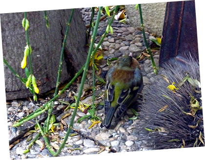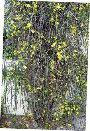 Ünner den Winterjasmin seet en lütten Bookfink. He söch Schutz vör den kolen Wind.