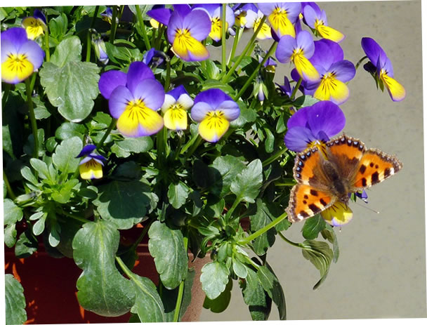 Up de Terrass stünn en Putt mit Glockenbloom in de Sünn. De harr Besöök vun enen Bottervagel, enen lütten Voss. Aver bald flöög he wieder un sett sik up en Viölchen vun de Blomenampel.