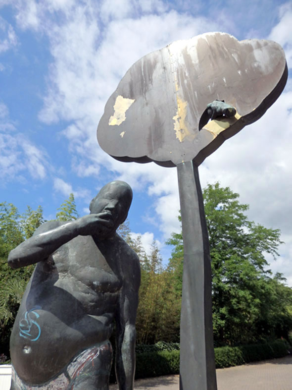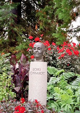 Dat heet jo, Eva hett den Appel vun den Baum der Erkenntnis afplückt, aver de Fru vun de Gesellschaft der FreundInnen des Botanischen Gartens hett mi vertellt, dat weer en falsche Översetten in de Bibel, meent weer de Affall Gottes. De Hamborger Pädagogin Hannelore Loki Schmidt (born 1919 in Hamborg und dor uk 2010 storven), de later mit den Altkanzler Helmut Schmidt verheirat weer, harr en Liedenschop för Biologie un weer bannig aktiv as Botanikerin, Natuur- un Plantenschützerin. (Quelle Wikipedia) Siet de 1970er Johren hett se sik för den Botanischen Goorn insett, dat heet, för de Erforschung un Erhaltung biologischer Vielfalt. Ehr to Ehren hett de düütsche Künstler Manfred Sihle-Wissel (born 1934 in Tallin/Estland) 2005 en Büste ut Bronze vun Loki Schmidt maakt. De steiht in den Loki-Schmidt-Goorn 'n Stück wieder achter den Hauptingang Ohnhorststraat (S-Bahn S1, Station Klein Flottbek, Buslinien 21 un 15).