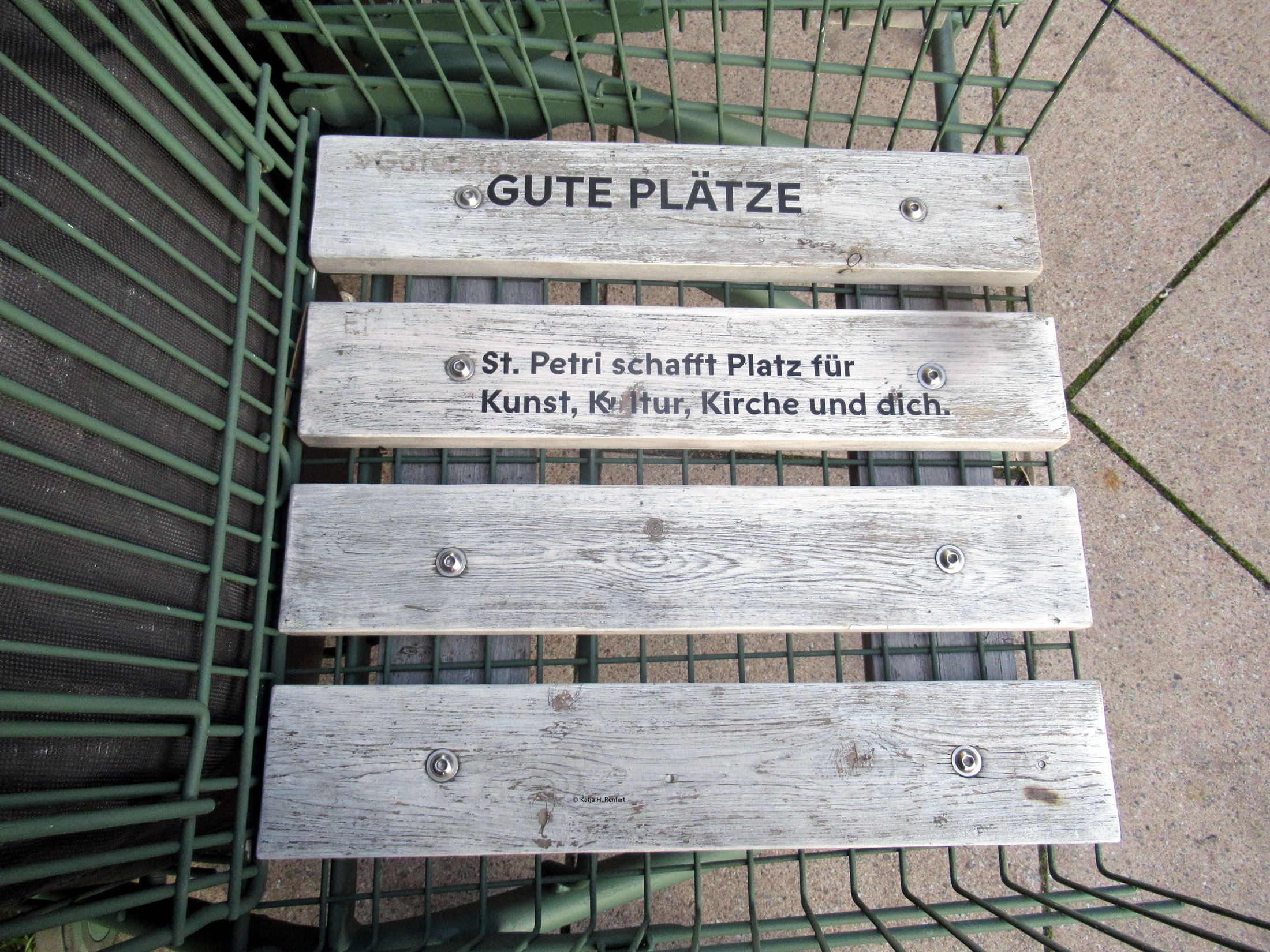 Denn weer ik bannig verbaast, worüm de velen Inköpswagen op den Platz stunnen. Dat Schild "Auf die Plätze" hett mi schlau maakt. Aver as ik vör poor Daag wedder an de Kark weer: keen eenzigen Wagen mehr. Ik heff an dat Karken-Büro schreven un de Info kreegen: dat is jümmers en "Sommer-Projekt". Dat fangt Enn Mai/Anfang Juni an, ahn en vörher fasten Termin. Üm de Wagens op den Platz optostellen, bruukt se jümmers de Verlööf vun de Stadt Hamborg. Eerst wenn se de hebben, köönt se denn ehr Projekt wedder starten.