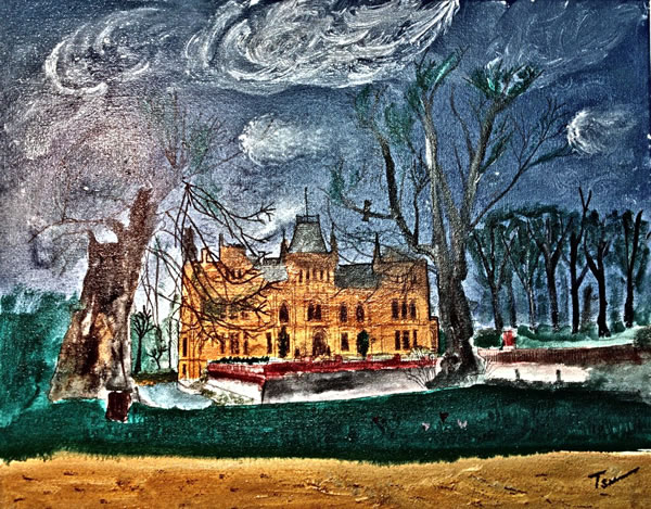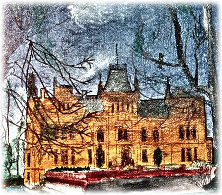 Düt Bild wiest de Evenburg in de ruge Vörjohrsküll. Op den Rasen vörn sünd man de eersten Krokus to sehn, de Allee is noch kahl. De Evenburg is en Waterslott bi uns in Leer.