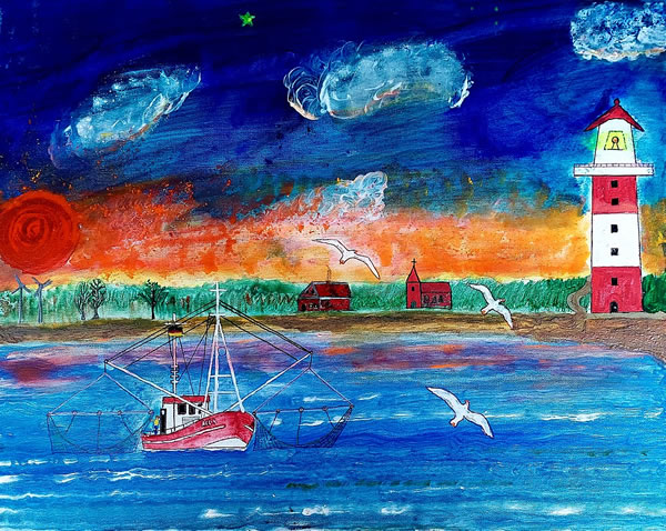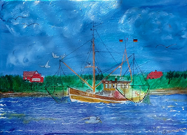 De Junior-Käptn steiht faken ok an de Reling un smitt en ganz eenfach Angel, avers he fangt ahn Enn meist jümmers dat Duppelte vun den Dörsnitt. Tje, de kennt sik ut. Wat de Käptns sünd, Vadder un Söhn, de gefallt ehr Arbeit, dat kannst sehn. Nix kann jüm ut de Roh bringen, nich maal, wenn een bi Ebbe oplöppt un fastsitt. Denn warrt beten rudert un mit de Lenzpumpen pumpt, un wenn allens nich hölpt, töövt se seelenruhig op de Floot. Un all, de an Bord sünd, köönt nix as liekso seelenruhig töven. Opregen helpt nich. Dat is de See. |