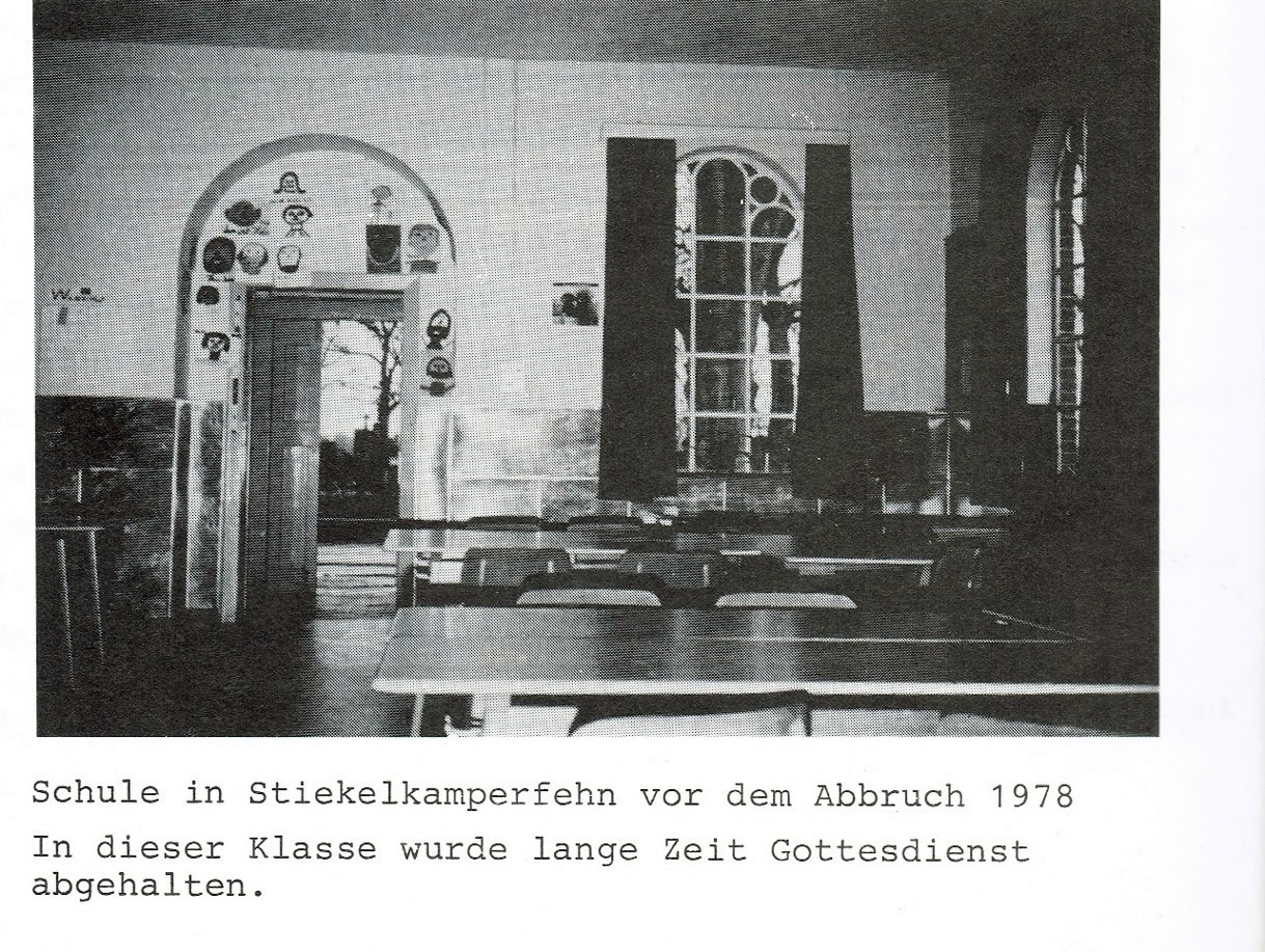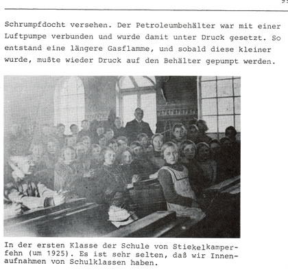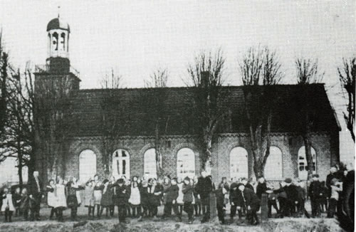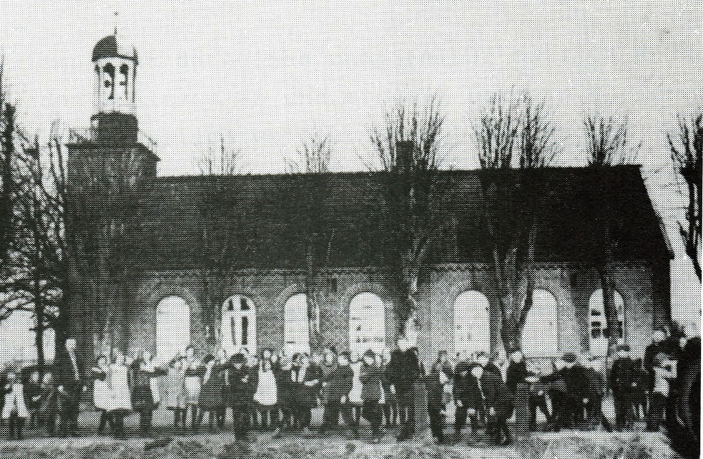 114 Johr hett de Schoolkark stunnen in uns Dörp. As se 1978 afreten woor, geev dat ok so'n Aart "Volksbegehren" in't Dörp, dat de Klockentoorn nich afreten warrn schull, ehrdat de ehmaligen Schölers dorvun Afscheed nehmen kunnen. Dat Bild baven wiest de Westansicht vun de School, dorachter links dat ole Lehrerhuus. Lehrer to de Buutied weer sachs en Herr Baumann en begängsche Naam in uns Rebett. In't Auswandermuseum in Bremerhaven warrt verklaart, dat Lü mit düssen Naam, wenn se na Amerika utwannern dään, sik in "Bowman" ümdöpen dään. Spannende Saken! De Liehrers vun fröher hebbt blangenbi heel eenfach un spartaansch leevt. Liekers weer dat sachs heel schöön. Nu folgt noch poor histoorsche Opnahmen. Se köönt de per Klick vergröttern.