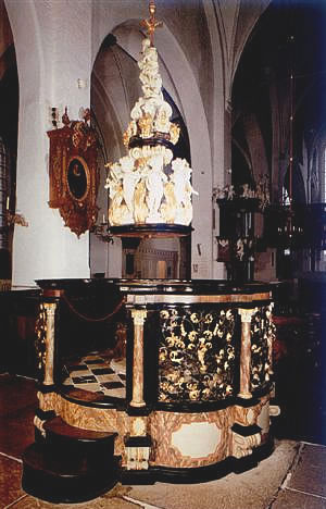 De Kanzel is so as de Orgel ut de Barocktiet. Dat Geld dorto keem ut