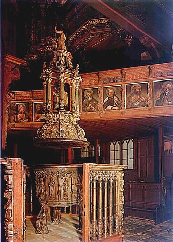 Na de grote Orgel geiht en Wendeltrepp hooch, vull vun Snitzwark. Langfingers