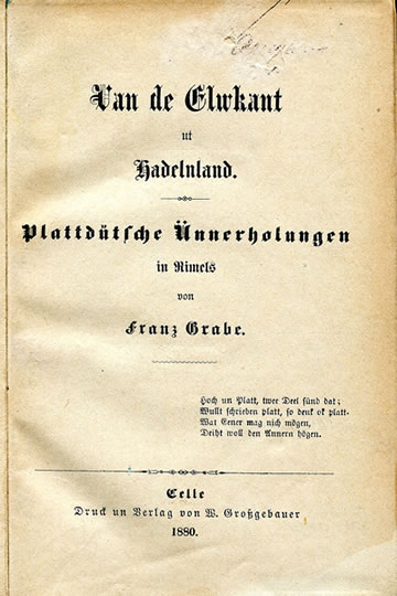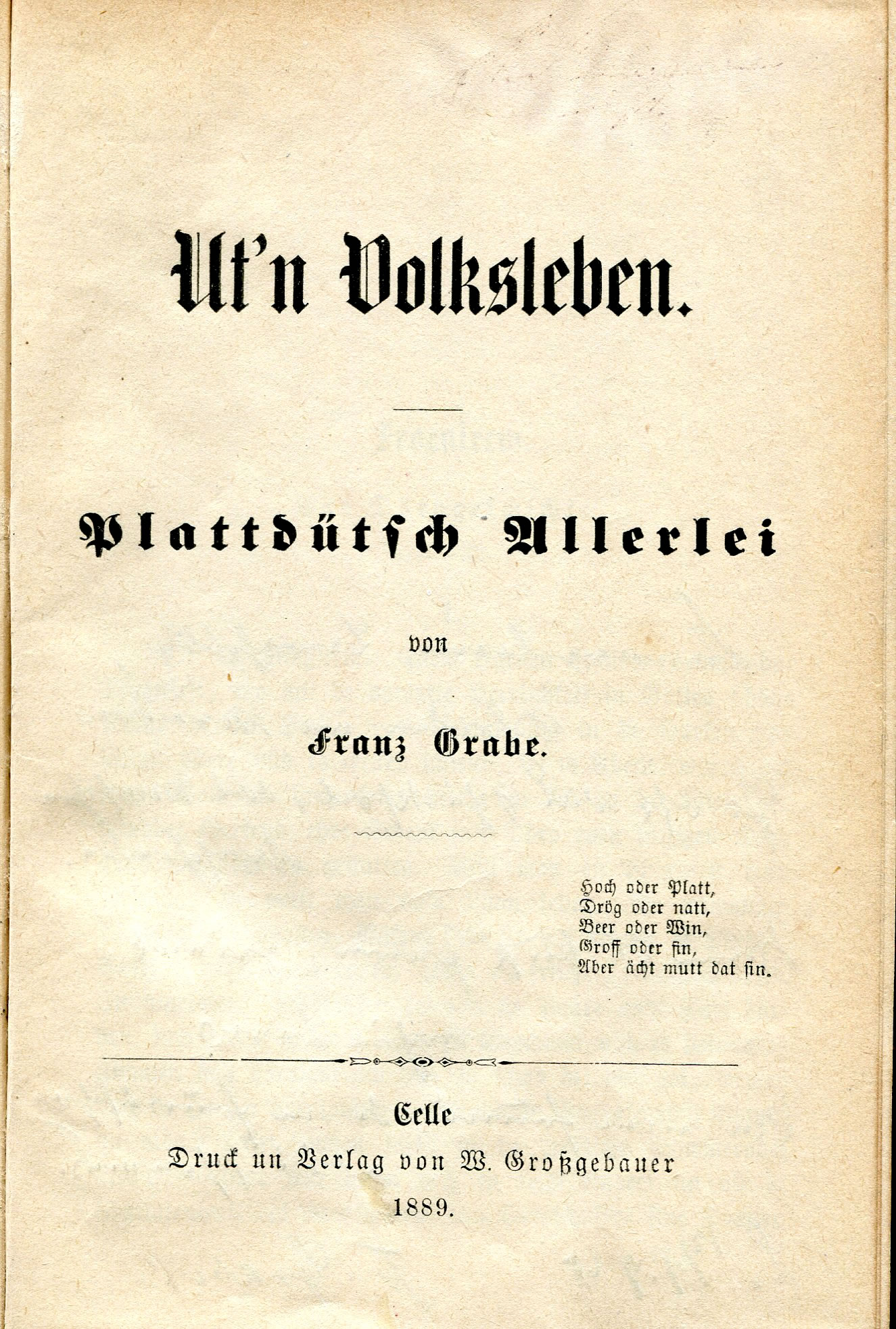 van Willi Höfig Dat Leven van Franz Grabe speel sik in twee Stadtdelen van Cuxhaven af, in Olenbrook (Altenbruch), wo he 1843 born weer un upwassen dee, un in de Worth (Lüdingworth), wo he hentrecken weer, as he 25 weer, bet he 1923 dood bleev. To siene Tiet weern dat sülvststännige Dörper, de eerst 1972 to Cuxhaven kemen. He göll as de beropen Heimatdichter van Lüdingworth, sien Roop güng bet in de USA. Franz schreev as 'n Korrespondent för de "Plattdütsche Post" in New York, un eenmaal worr he daarhen inladt, wo denn de Verlag en Festovend to sien Ehr geev. In de Geschicht "Froenleew" kümmt een ut Amerika torüch, wo he sien heelet Leven tobrocht harr, un seggt: "As du hörst, heff ik aber mine ole hartliche Modersprak noch nich vergeten. De sitt fast in'n Harten, as de Eekwortel in de Eer." Kaiser Willem II. verehr em 1913 dat Preuß'sche Verdeenstkrüüz in Sülver, un hüüt gifft dat noch in Lüdingworth ene Franz-Grabe-Straat. En bedüdende Schrieversmann in siene Tied. Un hüüt?