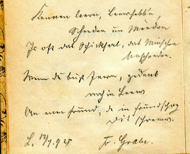 Markst den Ünnerscheed? Denn hett Franz Grabe doch woll utbottert. Grabe is keen utsproken Antisemit; man he hett siene Vörbehollen towedder de Juden. Disse Vöroordeelen weren in Düütschland in Grabe siene Tiet männichmal to finnen (wi weet jo: nich blots dunnemals, dat is hüüt nich anners). So warrt in de Humoreske "De Billerhannel" de juudsche Kunstfründ Salomon Bär (mit den Binamen "Salomon, de Mäcenasius") mit'n falschen Porträt van Mozart ansmeert, un to'n Sluss heet dat: "So hett mal de een Itzig den annern anföhrt, un de Mäcenasius söcht noch jümmer vergebens na sinen Mozart." Un de Hannelsmann, de den olen Herrn Braun in dat Gedicht "De Brillenhannel" anschieten deit, weer ok en Juud: "De Itzig deh em doch bedreegen." Sodenne Spröök kümmt vör, man faken finnst se woll nich. Mi dücht, dat leeg in de heele Sellschap denk an den groten Theodor Fontane, wo dat ok oft noog antisemitische Utrutschers gifft, mehr in siene Breev as in de Romans. Grabe wuss woll, wat in de plattdüütsche Literatur in siene Tiet los weer. In sien' Swank "Plattdütsche in Amerika" kümmt en "Gelegenheitsdichter" vör, un de heet John Brinckmann. De beropen mekelnborger Schrieversmann John Brinckman hör to de Generatschon van Grabe siene Öllern (*1814). Tofall?