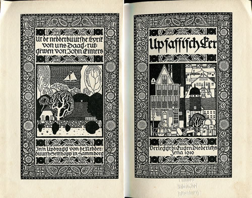 van Willi Höfig Up sassisch Eer: ut de nedderdüütshe Lyrik von uns Daag, rutgeven von John Eimers in'n Updragg von de "Nedderdüütsh Sellshopp" in Hammborg. Verleggt bi Eugen Diederichs, Jena 1910. Dat Book is vör 105 Johren in Jena druckt worrn. Verleggt hett dat Eugen Diederichs, de Weert daarup leggen dee, dat siene Böker goot antosehn un antofaten weern (un ok goot to lesen, man dat versteiht sik van sülben). Un so kannst dat denn ok hüüt noch geern in de Hand nöhmen. De Inband is 'n beten smuddelig worrn, un de een of annere Siet hett 'n Eselsohr afkregen. Daar harr männicheen sien' Kopp rinsteken, dat hett nich blots in't Schapp stahn. Un denn hett dat ok wat dörmakt: Kofft harr dat Börries von Münchhausen, de Balladendichter. Ehr dat bi mi landt is, stunn dat noch in de Landsbibliotheek in Altenborg. Kunn woll sien, dat Börries siene Böker daar henbrocht worrn, as he sik 1945 op sien Slott Windischleuba ümbrocht harr he weer Nazi un kunn sik woll utreken, wat em passeeren woor, wenn dat Drüdde Riek to Enn keem. De Thüringische Landesbibliothek Altenburg warrt 1951 dicht maakt; överblewen is de Stadtbökerie, de mit plattdüütsche Böker so recht nix antofangen weet, denn in Oostthüringen gifft dat keen Platt. Ik heff dat Book in de 1980er Johren in't Antiquariat kofft.