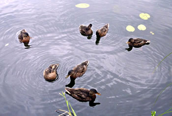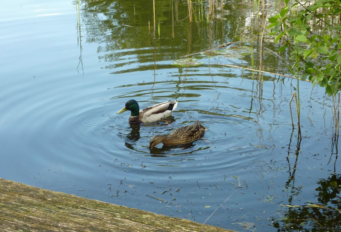 den Steeg swommen junge Aanten dicht an't Boot vörbi. Wi kunnen