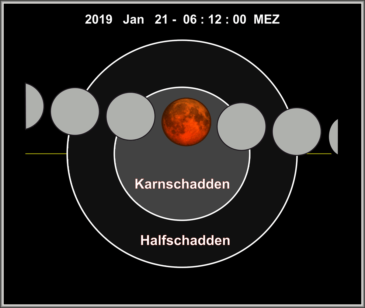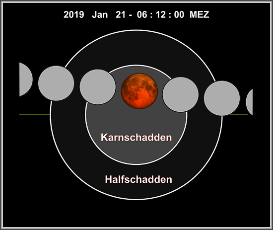 Blautmaond Dei Maonddüsternis in'n Januar 2019 van Ludgerd Lüske An'n Anfang van dei leßte Wäke kreegen dei freuh upstaohn Lüe einen besünneren Lohn: Dei Maond köm freuh an'n Maondagmorgen in den Karnschadden van dei Eern un hei wörd düster. Don sehg man blots noch eine rot schemmern Maondschiewe. Dit was för väle Johre dei leßte totaole Maonddüsternis, dei man van Middeleuropa ut seihn kunn.