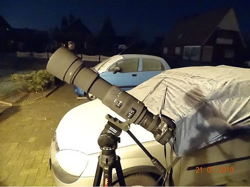 Freuh an den vergaohn'n Maondagmorgen wörn wi mit drei Lüe an dei Thülsfelder Taolsperre in Südoldenborg. Dor harrn wi use Kameras mit upsette Teleskope off Teleobjektive upstellt. Dei besten Billde mök don Wolfram Rüger. Sien Kamerawark bestünd ut ein Dreibeinstativ mit einen Driew-Apparaot, dei den Maond immer automatischk in dei Bildmidde van dei Kamera stellt. Bi eine Kölde van -8,5 °C mößden wi us warm antrecken, aower dei Maihte hätt sick lohnt!