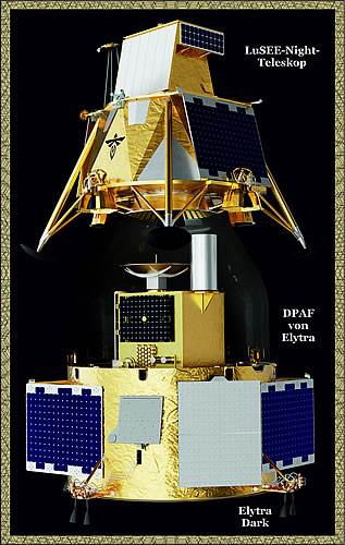 Wo et hengaiht Nao dat Utsetten van dei Füerfleig-Elytra-Sonde in den Maond-Ümloop schall dei Blawe Spauk-Lander an dei wietest afflägen Maond-Lande-Stä landen. So wiet weg is man up dei Maond-Achtersiete noch nich kaomen. Nao disse besünnere stille Gägend kummp dat Erd-Hochfrequenz-Bruusen nich hen. Dei Maond schermt uck dat Bruusen van dei Sünne in dei Maond-Nacht mit aff. So kann man hier wunnerbor gaue Daoten äöwer dat kosmischke Middel-Öller faoten. Dat staopelte Ruumfohrtüg Baoben an den Staopel bliff dat LuSEE-Nacht-Teleskop van dei NASA an den Lander sitten. Van dor ut kann man dei Radio-Straohlung van den Maond-Bodden mäten. Blawe Spauk schall up den Apparaote-Dräger (DPAF) van Elytra sitten blieben un bi dat Landen up dei Maond-Achtersiete Daoten-, Energie- un Warmte-Reserven läwern. Dei Maond-Paddseuk-Satellit is in den Dräger van Elytra inbawt un schall in den Maond-Ümloop gaohn. Van dorut schall disse Apparaot dei Naorichten för taukaomen Maond-Missionen bewarken. An dat ünnerste End van den Staopel schall Elytra Dark at eine Äöwerdräg-Brügge warken un in den Maond-Ümloop blieben. Hier warkt dat at Naorichten-Station un kann bi dat Kalibreiern van Blawe-Spauk-Bodden-Apparaote helpen.