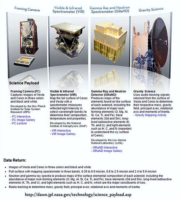 Nimmp den heelen Bodden van Ceres un van Vesta mit dit Spektrometer up. Dorbi werd dei Intensität van dat trüggestraohlte Lecht mit utsöchte Wellenlängten mäten. So kann man Tausaomesetten, Temperatur un Eigenschkupen rutfinnen. Bawen dö dit dat Nationaol-Astrophysik-Institut (INAF). Ünner disse Links finnt man noch mehr (up englischk): Gamma-Straohlen- un Neutronen-Detektor (GRaND)