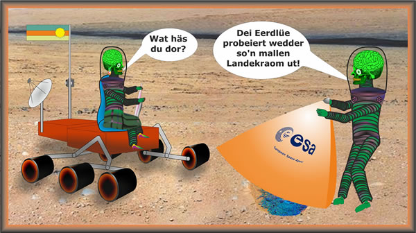 van Ludgerd Lüske An'n 19. Oktober 2016 kummp dei ExoMars-2016-Mission in den Ümloop bi den Mars an. In dei süftige Tied dait dei Landeapparaot Schiaparelli up den Marsbodden landen. Inlaoden Reporters van väle Medien sünd bi dei twei Daoge duuren Aktion in dat Ruumfohrtzentrum van dei ESA in Darmstadt mit dorbi. ExoMars is eine Mission van dei ESA un dei russischken Weltruumbehörde Roscosmos. Dortau hört dei Trace Gas Orbiter (TGO) un Schiaparelli, dei "Entry, Descent and Landing Demonstrator" (EDL).
