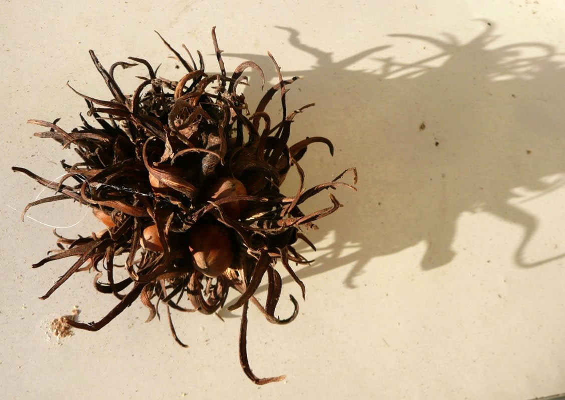 Boom legen en Barg leere Nuttschalen. Dorneven ok noch so stickelig