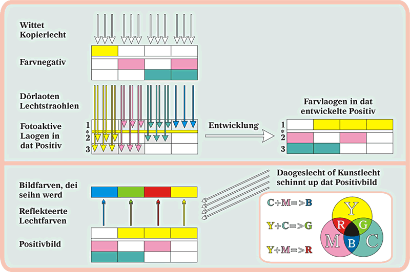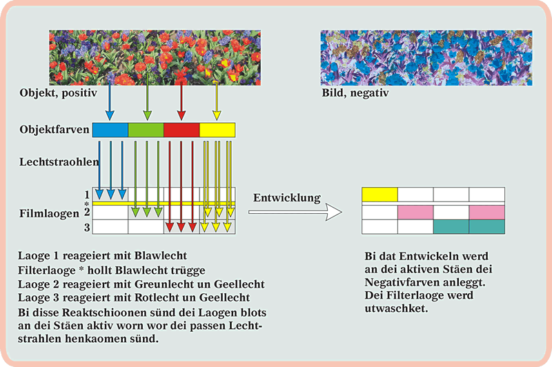 vun Ludgerd Lüske Wo geiht dat äöverhaupt mit einen normaolen Farvfilm? Dat Wiesen van Farven up'n Bildscherm (tau'n Bispill: Fernsehapparaote, Monitore) un up druckte Farvbiller un Farvfotos geiht mit dei drei Farven: Rot, Greun un Blaw. Dormit käönt alle annern Farven anmischket wern (süh bi geel). Ein Schemao schall us dat verklorn: Afbild 1: Belechten und Entwickeln van ein Farvfilmnegativ. Se köönt dat Bild dör Klick vergröttern! Trügge kaomt Sei wer mit den "Zurück"-Knoop up dei Symbollieste Farvfilme hebbt meist drei fotoaktive Laogen up einen dörsichtigen Unnergrund. Disse Laogen sünd so inricht, dat dei blots up dei utsöchten Farv-Andeile (Rot, Greun, Blaw) van dat Lecht reageern käönt. Dat blawe Lecht maokt dorbi Probleme: Alle Filmlaogen reageert dormit. Dorümme werd unner dei böverste Laoge för Blaw eine geele Filterschicht tüschkenleggt. Dei lett dit Blawlecht nich dör. So werd dei annern Laogen dorgägen afschermt. Up dei Stäen, wor dei Lechtstraohlen dei fotoaktiven Laogen draopet, werd disse aktiveert. An disse aktiven Stäen werd bi't Entwickeln dei Negativfarven (geel (Y, yellow), purpur (M, magenta), blaw-greun (C, cyan)) anleggt. Man Negative bekieken helpt us nich wieder, sünners bi Farvnegative geiht bi us in' Brägen alls dörnanner, wi seiht kien örnlicket Bild! So, nu mutt dat Negativ wer herhollen. Wittet Kopierlicht lett man in einen Vergrötterungapparaot dör dat Negativ schienen. Up dat unnerliggen Foto-"Papier" (is vanoage nich mehr ut Papier, sünnern ut Kunststoff) kaomt blots dei Lechtfarven an, dei van dat Negativ dörlaoten werd. Dat Fotopapier hett so as dei Negativfilm 3 fotoaktive Laogen (süh Afbild 2), mit eine geele Filterschicht unner dei eierste Laoge. Disse Laogen verhollt sik jüs so as bi den Negativfilm un kriegt bi't Entwickeln uk dei süftigen Farven anleggt (Y, M, C). Dei Unnerlaoge is witt un schmitt dat upschienen Lecht wer trügge. Afbild 2: Kopeeren van dat Negativ tau ein Positivbild. Se köönt dat Bild dör Klick vergröttern! Trügge kaomt Sei wer mit den "Zurück"-Knoop up dei Symbollieste