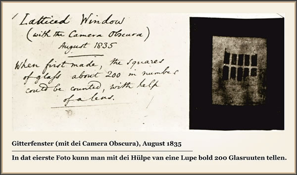 In'n August 1835 nöhm William Henry Fox Talbot dat allereierste fotograofischke Negativ van dit Fenster up.