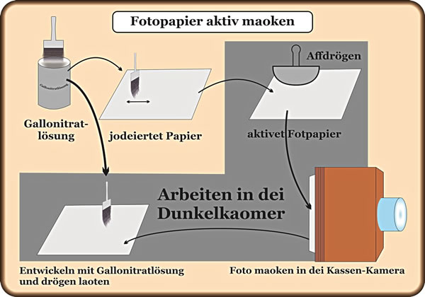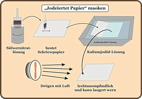 Taueiers wörd "jodeiertet Papier" herstellt. Dorbi bestreek man dei eine Siete van ein Blatt bestet Schriewpapier mit eine Sülwernitraotlösung un löt dat drögen. Dornao duukde man dit präpareierte Papier in eine Kaliumiodidlösung un löt et wedder drögen. Dorbi geef et ein Gliekgewicht van dei Chemikaolien. Dat Papier was so praktischk unempfindlick gägen Lecht, man kunn et so orig lange laogern. Vör dat Upnähmen bestreek man dei präpareierte Siete mit eine "Gallonitrat-Sülwer"-Lösung. Dei bestaiht ut Sülwernitrat, Essigsüre un Gallussüre. Dornao drögde man dit aktive Papier sachte mit eine Ort Löschkpapier un belechtede et in dei Kamera. Achternao dö man dat Papier wedder sachte mit mehr Gallonitrat-Sülwer-Lösung bepinseln un dorbi dat Papier vörsichtig upwarmen. At dat Entwickeln fardig was, speulde man dei Kalotypie un drögde ein bäten. Dornao köm ein Stabiliseiern in eine Kaliumbromidlösung. So wörd dat äöwerbläben aktive Sülwerjodid tau ein inaktivet Sülwerbromid. Man kunn uck mit eine heite Natriumthiosulfat-Lösung "fixeiern". Dorbi lösde sick dat Sülwerjodid up un man kunn et licht utwaschken, worbi blots dei Sülwerdeilkes in dat entwickelte Bild äöwerbleeben un dei Kalotypie nich mehr up Lecht reageiern kunn. Mit dei Kalotypie-Maude kreeg man ein dörschienen Originaolnegativbild, van dat man dör einen einfachen Kontaktaffdruck eine Riege Positive herstellen kunn. So har Talbot einen Vördeil äöwer dei Daguerreotypie-Maude, dei ein undösichtiget Originaolpositiv herstellde, wovan man blots dör eine Upnaohme mit eine Kamera mehr Positive maoken kunn.