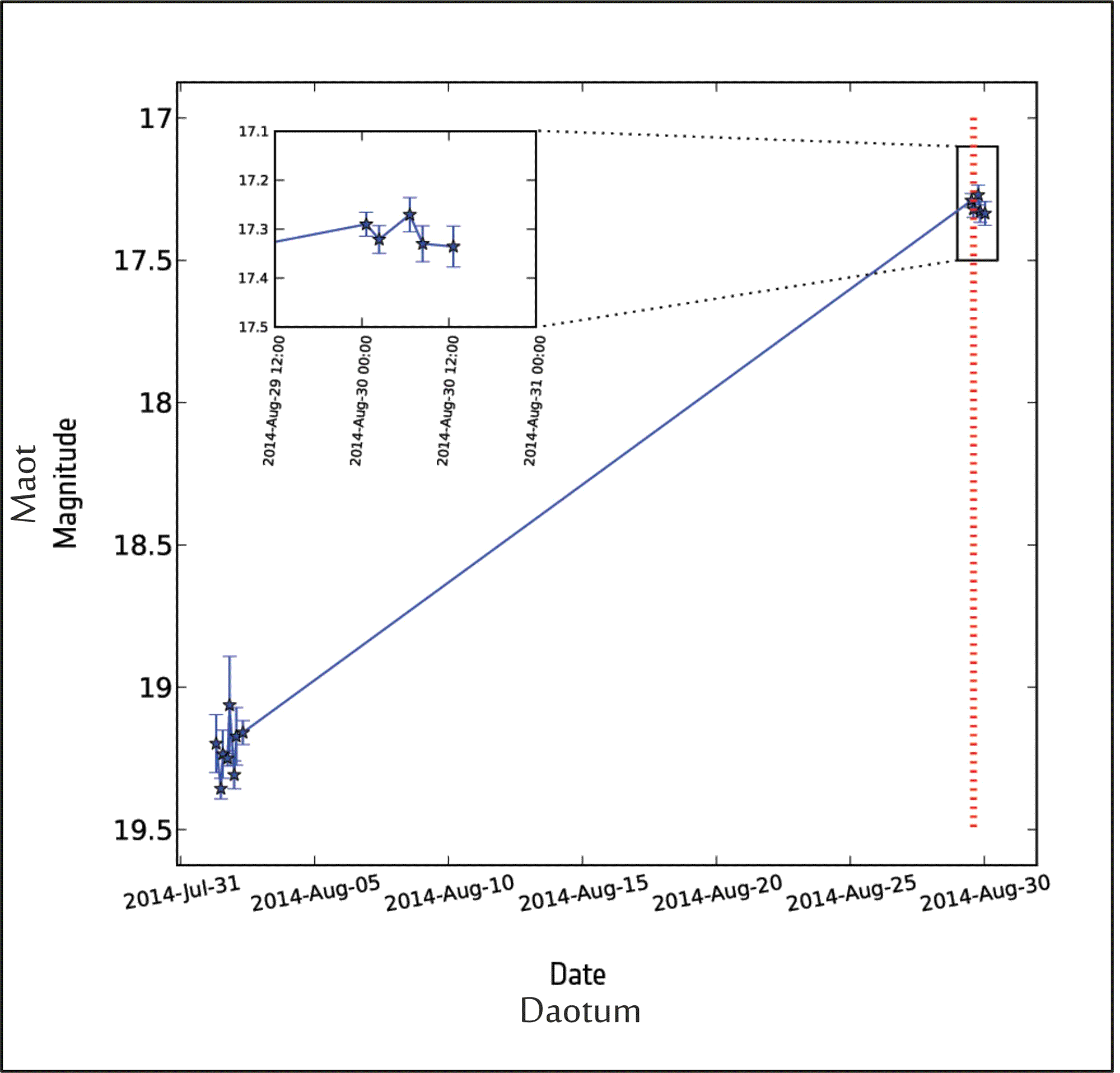 Dr. Hodgkin hört tau dei Gaia-Alarm-Mannschkup, dei van Astronomen van dei Universität van Cambridge (UK) un Warschau upstellt wörd un bi dei Scansichtungen nao besünnere Ännerungen seuken dait. Et duurde nich lange un dei fünnd an'n 30. August 2014 dei eierste "Anomalie" in dei Form van ein drocket Anstiegen bi dei Intensität van ein Lecht, dat ut eine ferne Galaxie kummp. As Gaia einen Monat vörher dei süftige Galaxie sehg, scheen dei noch nich so lecht. "Wi dachten forts, et kunn eine Supernova wän, aower man bruuket mehr Wiesteiken för ein fastet Resultaot", verklort Lukasz Wyrzykowski van dat Astronomischke Observatorium van dei Universität Warschau.
