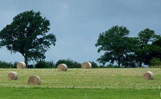 is afmeiht un up de Stoppelfeller liegt grote Heu- un Strohrullen.