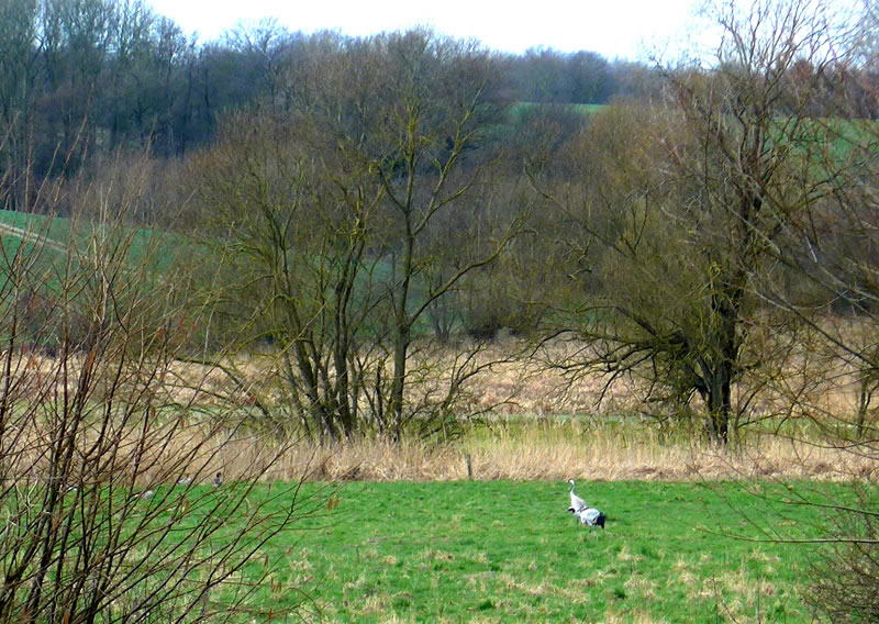 Ik harr mien leve Not, in dat Auto to klattern, de Instieg weer so hooch! De Fohrt güng över Wischen un Feldweg, egal ob matschig or fast. Se wies in't Feld: "Da unten ist der Lauf der Schwartau!" Un lütt Stück wieder weer en See, de Barkauer See to sehn. Up de Wisch vör de Au spazeern twee Kraniche. Noch wat wieder drepen wi Arbeider, de den Tuun repareern. Fröhlich reep uns Gastgeversche de Lüüd to, se sullen doch dat Gatter för se uplaten. Un wieder güng uns Fohrt. Wi kunnen uns gor nich satt sehn. De Fohrt över de Feller ümmer mit de Utsicht na de Schwartau ward wi seker nich vergeten.