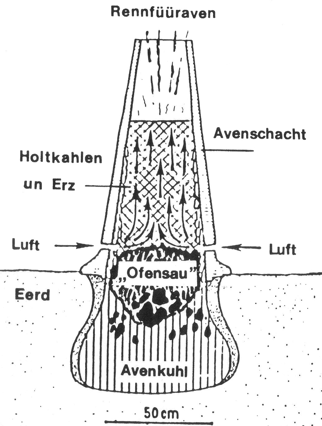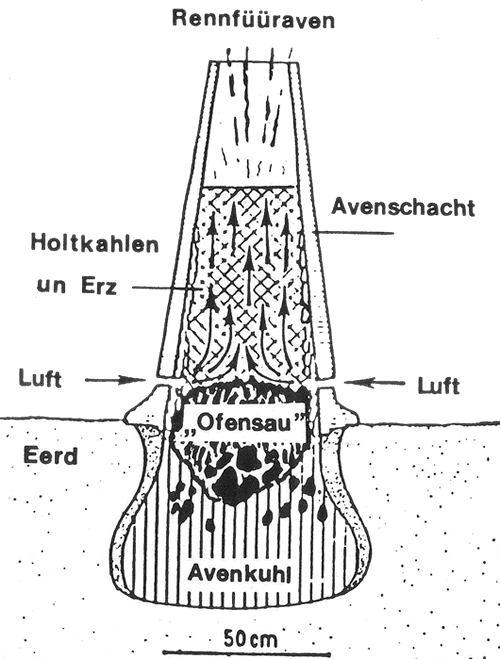Dat ünnerste Enn vun son en Rennfüüraven weer nix anners as 'n runne Kuhl vun 80 cm Breede un Deepde. Up den Bodden legen Sand un Steen. Över de Kuhl harrns 'n runnen Schloot ut Lehm un Ruten upsett, de bit 120 cm hooch weer. In den wöörn vun baben tonööst sparrige un groote Holtkahlenstückens rinsmeten, de öllig 'n Luftschicht friehollen. Jüst an de Stell wöörn vun buten in den Lehmschloot Löcker rinbohrt, dormit de Aven Tooch harr. Up de sparrige Schicht keem denn 'n Gemeng vun Raseniesenerz un lüttere Holtkahlenstückens. Sodraad de Glimmerslippens mang de Kahlen legen, hebbt de Lüüd dat Füür vun ünnen her anbött un dörch Puusten in de Gang hollen. Veel hett dorbi türlich ok de Wind daan. Bi en Hitten vun över 1100 Graad wöör dat Erz de Suurstoff wegnahmen, so dat sik regelrechte swore Iesenkristallen billen kunnen. Düsse Iesenluppens sacken na'n Stootstiet 'n lütt Stück na ünnen un geven mit Sand un Schlacken tohopen 'n höckerigen Kluut af, de "Ofensau". Dat Mehrste vun de Bimengungen leep as Schlackenbrie na de Sieden vun den Schloot. Vun dor kunn een den Schlackenstroom toeerst na ünnen un denn na buten föhren. Klor, dat Iesen in den Kluut wöör reiner. An düssen Kluut ut Iesen un Schlacken kunnst du blots rankamen, wenn de Schloot tweihaut worrn weer. Denn hett een de Iesenstücken vun de Ofensau avhackt un afklarrt un in Smeedfüürn, de oftins in "Hütten" in de Gang hollen wöörn, noch mehrmols to'n Sweetgloot brocht un jümmers reiner kloppt. Toletzt kunnen de Klumpen denn up Steenambossen to Sweertklingen, Speerspitzen, Strietäxten, Bielen un Ploogschaarn breethamert warrn.