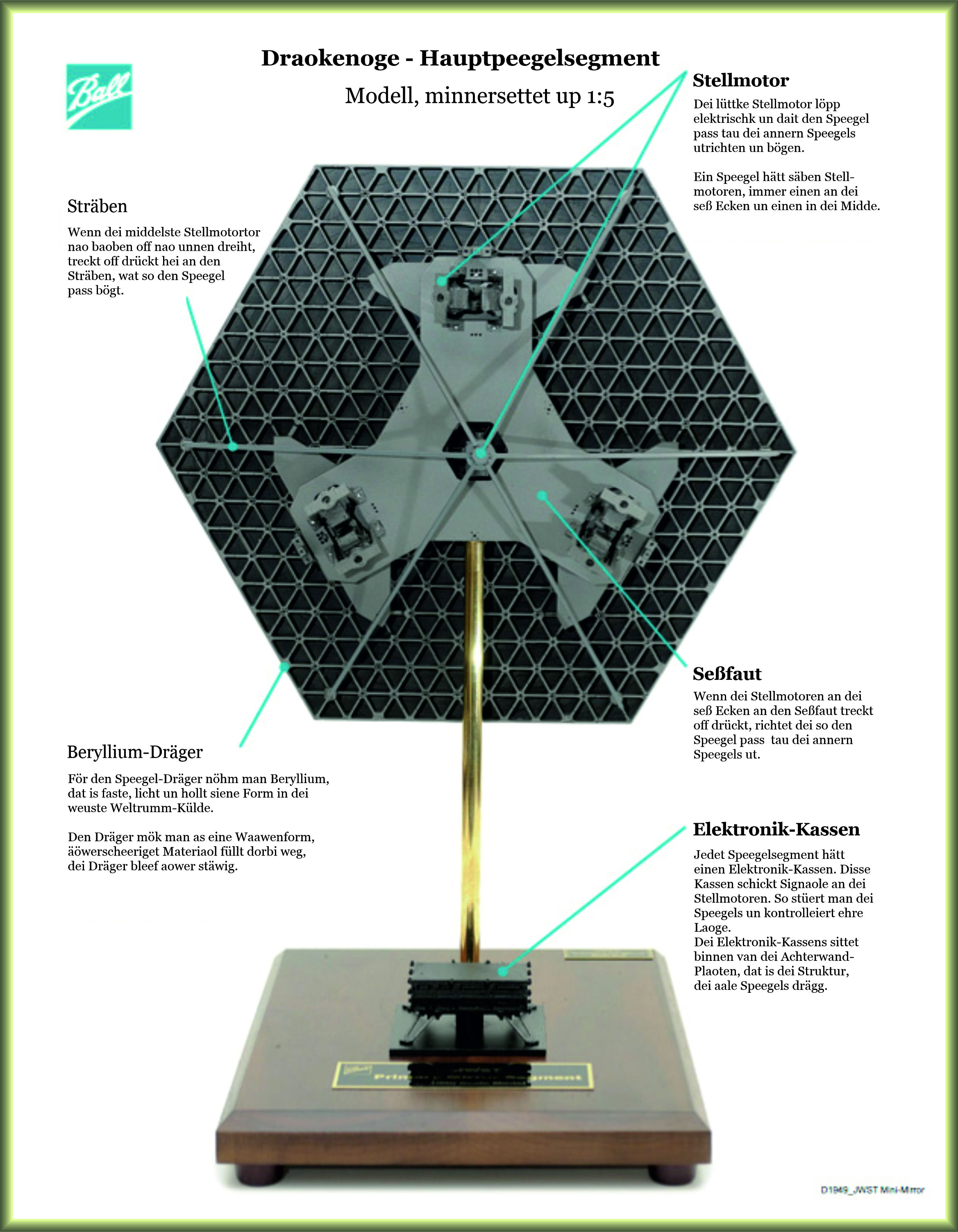 Lee Feinberg hei hätt dat Leit äöwer dat Optischke Teleskopelement van Draokenoge verkloort: "Dei Utrichtung van dei Hauptspeegel-Segmente, dei warket as ein einkeln grooten Speegel, bedütt, dat jede Speegel up 1/10000 van dei Dickte van ein Menschen-Hoor utrichtet is." Noch wunnerlicker is: Dei Ingenieure un Wätenschkup-Lüe, dei an dat Draokenoge-Teleskop warket, mössen disse Technik worhaft nei rutfinnen. Sei häbbt dat henkrägen. Opneegst warrt wi dat an dei Biller van Webb sehn.