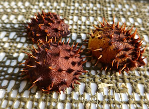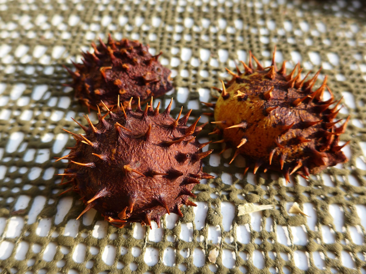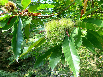 sehn. Ünner den echten Kastangelboom legen dicht an dicht stickelige