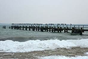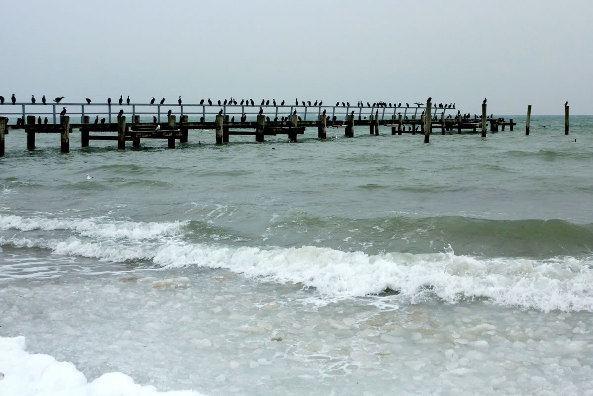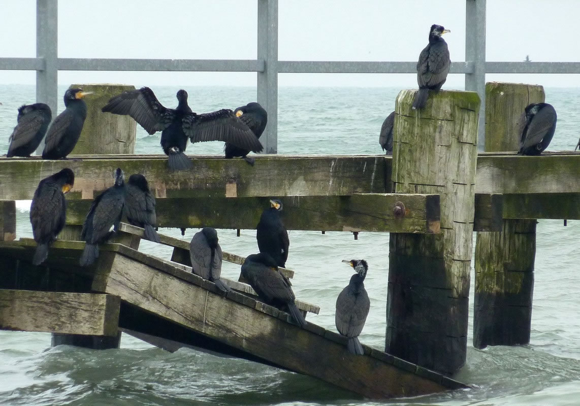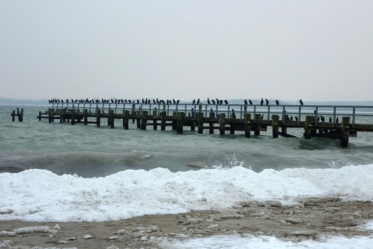 Dat eerst Mal sehn heff ik welk vun düsse swatten Gesellen in de söventiger Johrn. Wi schippern mit uns Boot na Niendörp. Dor seten welk up de Pahls, nehm de Fischer ehr Netten utleggt harrn, un luurn na Fisch. Vull Höög hebbt wi to Huus vun uns Beobachten vertellt. Korte Tiet dorna sünd wi denn de eersten Kormorane up en Badesteeg in Tramünn wies woorn. Ümmer weer uns Freud groot, wedder de swatten Gesellen to sehn. Vele Johrn sünd in't Land gahn. De Kormorane hebbt bannig tonahmen. In Fischereehaven luurt meist up jedeen Poller en swatten Gesell. Kaamt de Fischkutter mit Fisch in den Haven, fallt se över den Bifang un Affall her. Geihst du hüüt de Promenaad lang, kannst du bit to hunnert swatte Gesellen up de Badbrüch tellen. In en lang Reeg sitt se up dat Gelänner un de Planken. Dor is keen Placken mehr frie. All luurt se up Fisch. Welk dröögt ok ehr Fedderkleed. Sühst du de velen Kormorane, de all na Fisch luurt, kannst di