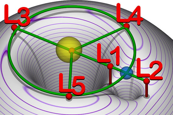 Sünne (gäl) un Eern (blaw). Lagrange-Punkte sünd