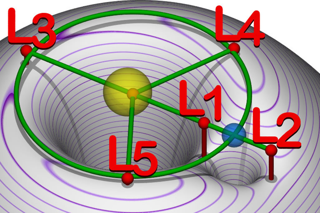 Dat Bild wieset dei Lagrange-Punkte L1 bit L5 in ein System ut