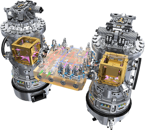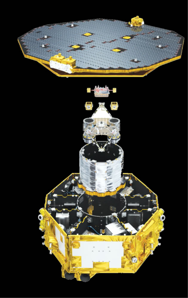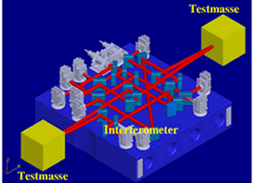 in dei Ümloop-Laoge as Gummidauk-Modell). Dei Teiknung baoben wiest dat Lisa-P-Technik-Paket. Dei beiden Goldwürfels, inschlaoten in Vakuumpötte (hier mit dat Affscheit-Schlott wiest), sünd dei Schläödels tau dei Lisa-P-Mission. In jedein'n Elektroden-Container is eine Gold-Platin-Testmasse. Lisa-P werd dei beiden Würfels bi Freifall-Aktionen mit ein hochpräziset Laser-Interferometer kontrolleiern. Dat Inferometer up eine optischke Bank ligg tüschken dei beiden speegeln Massen. Up einen 20 cm maol 20 cm groten Block ut Zerodur-Keramik-Glas sitt ein Satz van 22 Speegels un Straohldeilers.