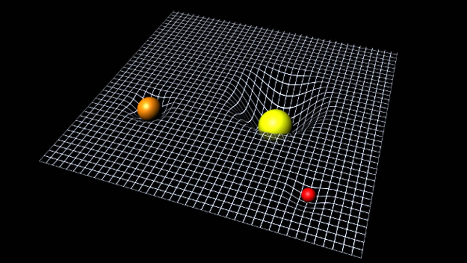 Dit Bild wieset dei Ruumtied as einen einfachen tweidimensionaolen Plaon, dei dör drei massive Objekte, as farwde Kugeln dorstellt, daoltrocken werd. Dit Daoltrecken is proportionaol tau dei einkeln Kugelmasse. So ein Daoltrecken in dei Ruumtied lenket dorbinnen dat Bewägen van ein massivet Objekt. Anners seihn, wenn sick massive Objekte in dei Ruumtied bewäget, werd dat Daoltrecken ännert un dei Geometrie van dei Ruumtied ännert sick staodig. Gravitation beschriff dornao ein dynamischket Wark tüschken Materie un Ruumtied.
