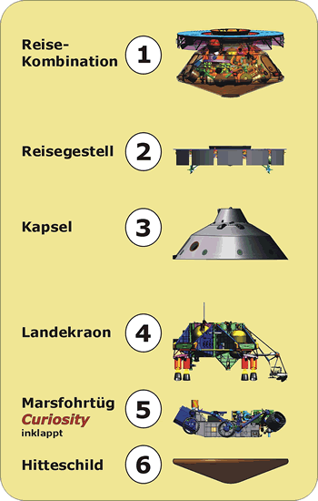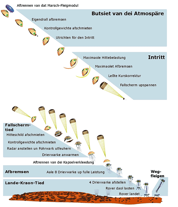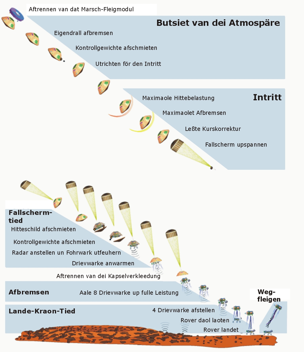 So pulterig un unnau as dei vörigen Marsfohrtüge schull Neiwind nich up den Mars landen. Wo man nau up einen annern Planeten landen kann, hett us dat Apollo-Programm wieset. Mit eine Landefähre (Bild baoben) stürde man up dei Stäe tau, dei vörseihn was. Dei Astronauten kunnden van disse Stäe ut uk wedder starten tau'n Trüggefleigen. Dorbi bleef dat unnerste Gestell, dei Startrampe, up den Maond staohn. Dor steiht dat Ding nu noch, as man up NASA-Fotos seihn kann. Bi dat leßte Lande-Unnernähmen up den Mars hett man disse Technik bolde so wedder bruket. För dei Marsreise dö man dei einkeln Deile tau eine Reisekombination (1) tausaomepacken. Baobenup (baoben tauminnst in dei Teiknung) is dat Reisegestell (2). Dorunner kaomt Kapsel (3), Landekraon (4), Marsfohrtüg (5) un dat Hitteschild. So dune tausomepacket passt dat heele Wark gaut in den Raketenkopp. So is disse Kombination, vörweg mit dat Hitteschild, gaut rüstet för den langen Weg nao usen Naoberplaneten. Kump dit Reisepaket bi dei Marsatmosphäre an, werd eine orrige Riege an Programm-Deile in'n Gang bröcht. Noch butsiet van dei Marsatmospäre werd dat Reisegestell (Marsch-Fleigmodul) aftrennt. Dei inkapselten Landedeile werd up Kurs bröcht un afbremst. Denn spannt sik dei Fallscherm up un denn geiht et daol in dei Atmosphäre rin.