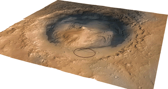 So kann et up siene Räöe landen, halfwegs pass up den Platz, den dei NASA vörseihn hett (süh Kring up dat Bild nerrn). Dei Landekraon flüg denn gau weg un stört besiet up eine annere Stäe af. Nu kann Neiwind sik taurechtemaoken för dei Forschkungsarbeit up den Mars.