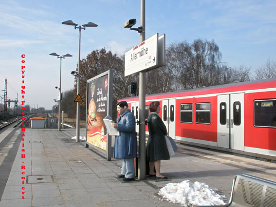 De beiden (dat Foto heff ik in Februar maakt) staht dor Dag un Nacht, bi Wind un Wedder un töövt op de Iesenbahn. He steiht allerdings op de een Siet, se op de annere Wat dat wull to bedüden hett? Een Fru vun den Kommunikations- un Kunstvereen Allermöhe e.V. hett mi vertellt, de Künstler Frank Voigt ut Pinnewitz hett de beiden Skulpturen 2008 maakt.