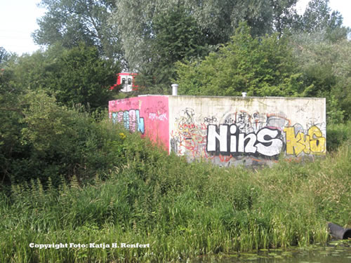 Op mien Weg heff ik uk'n lütt Huus entdeckt Platz för Graffiti is wull överall. Baben op dat Foto is de S-Bahn to sehn, de scheet jüst achter de Bööm langs.