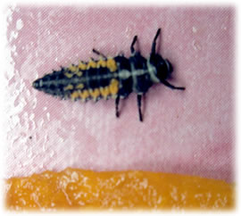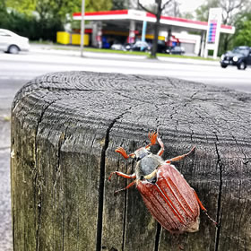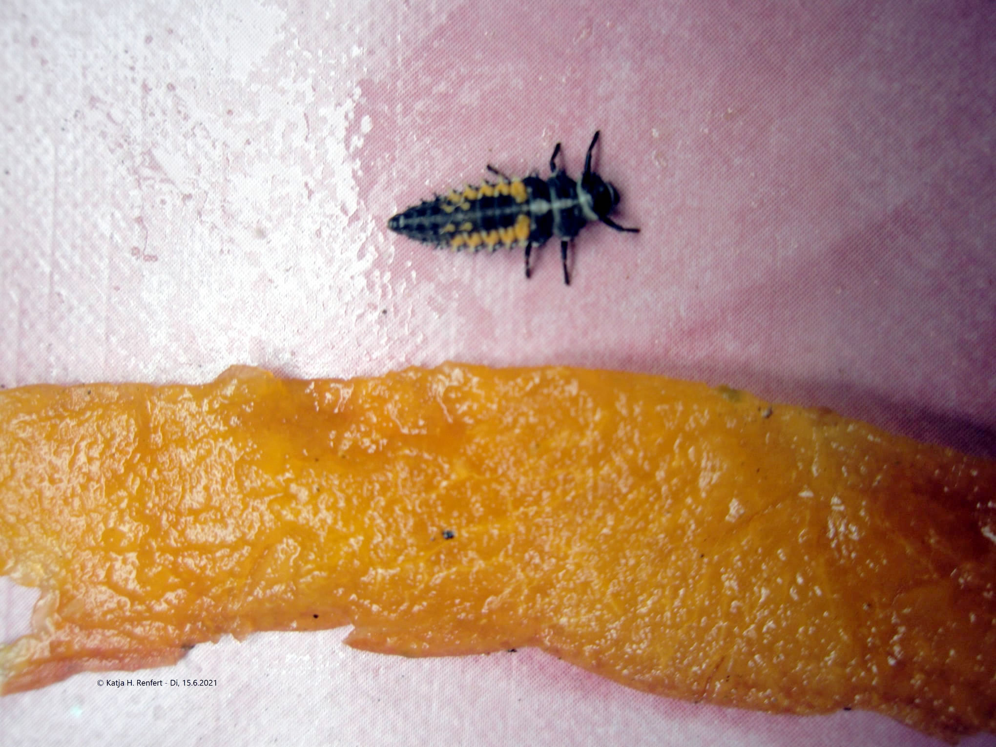 Mien Fohrrad-Plaan is heel un deel backsig vun de Linnenbööm vör uns Huus dat heet, vun dat Pipi vun de Blattlüüs, de in den Boom op de Bläder sitt. Un woneem de söte Blattluus-Pipi is, is de Larv vun'n Marienkäver nich wiet. Se bevölkert ok mien Plaan, un een hett sik sogor op mien Balkon verbiestert. Dor heff ik mien Besökersch en Stück Aprikosen-Pell henleggt. Se hett mit Weel vun den söten Saft runüm fröhstückt un ok an de Schaal nascht. So'n lecker Backskraam is doch wat anners as Lüüs-Pipi! Dat Bild köönt