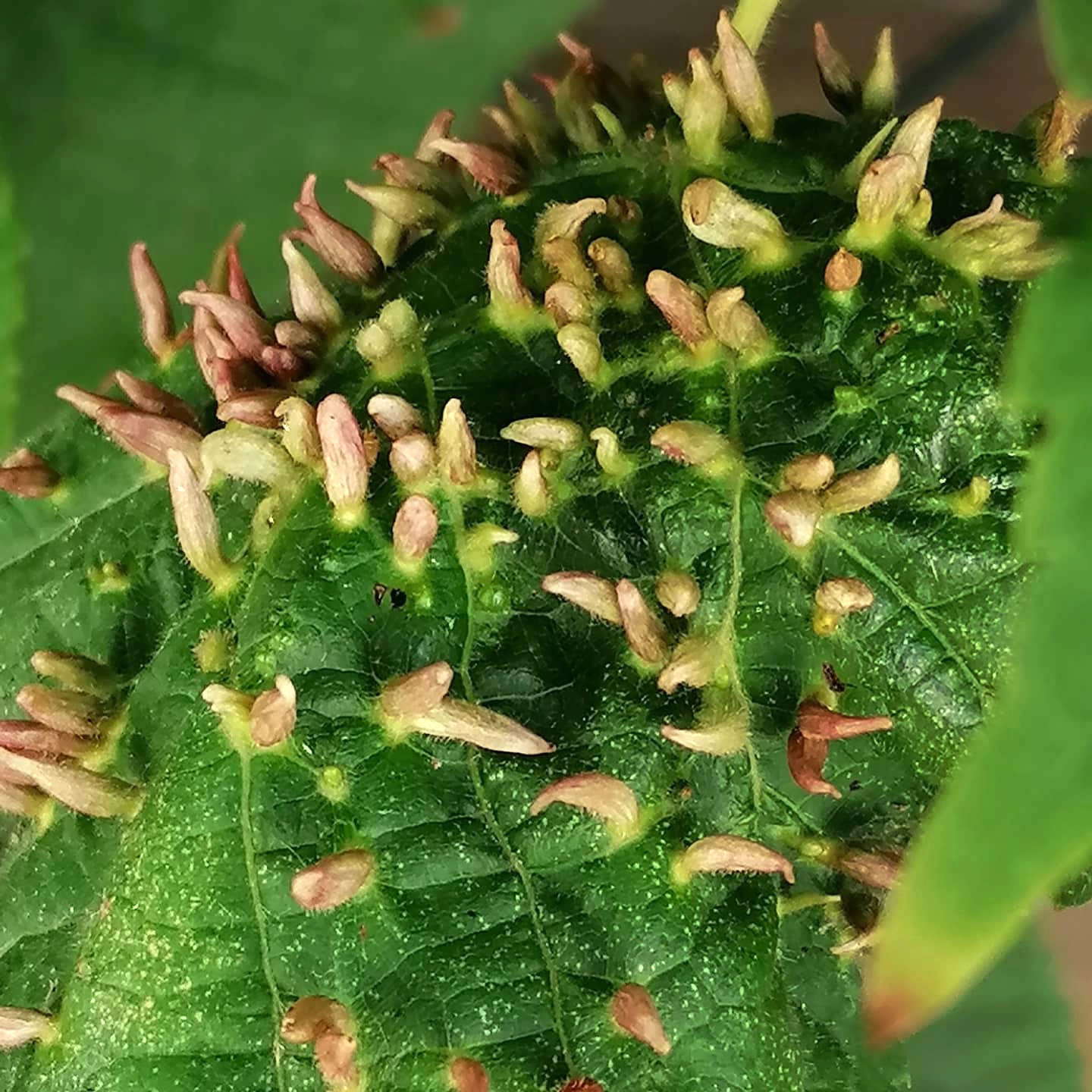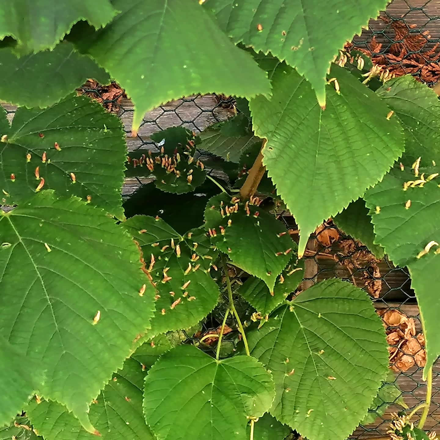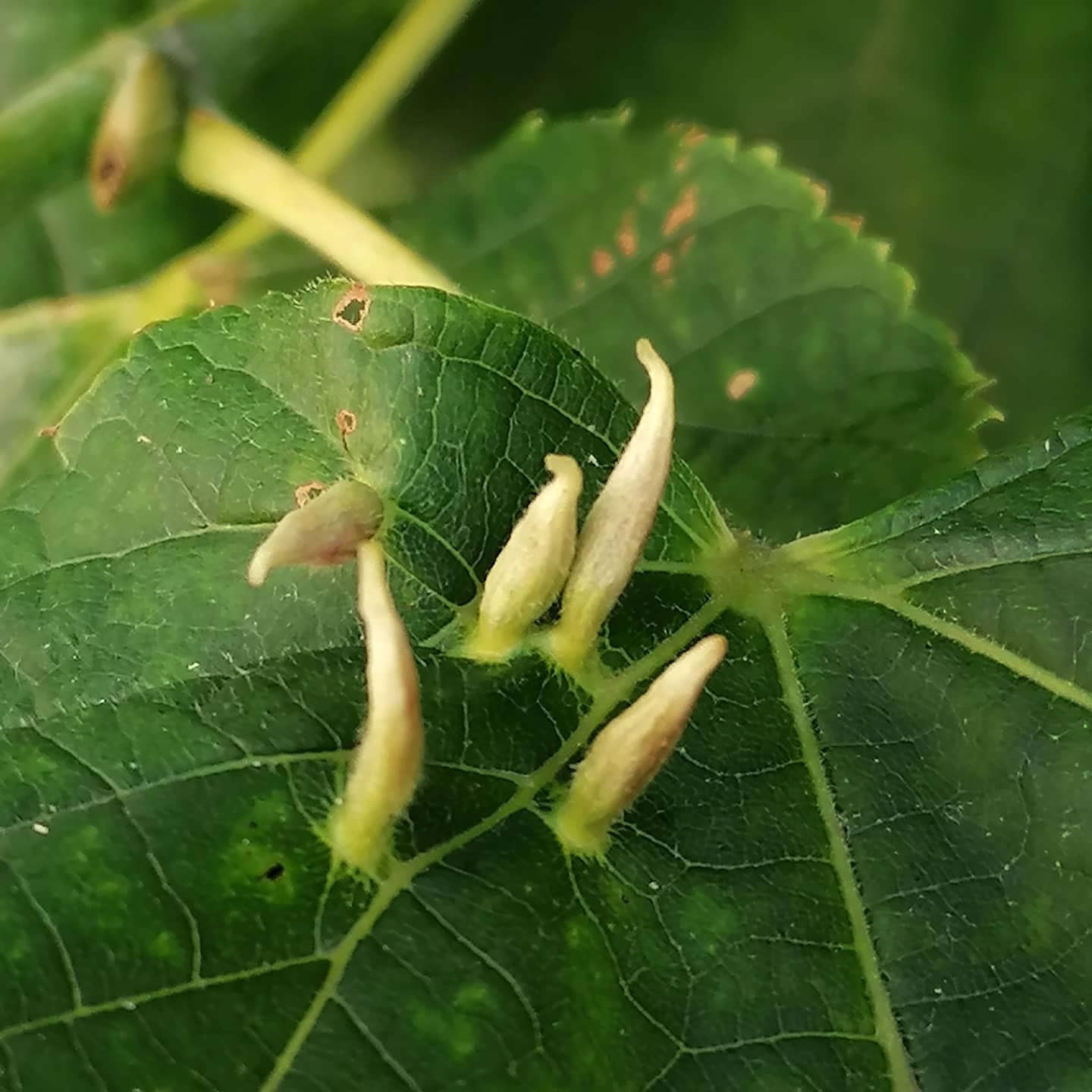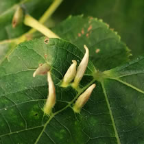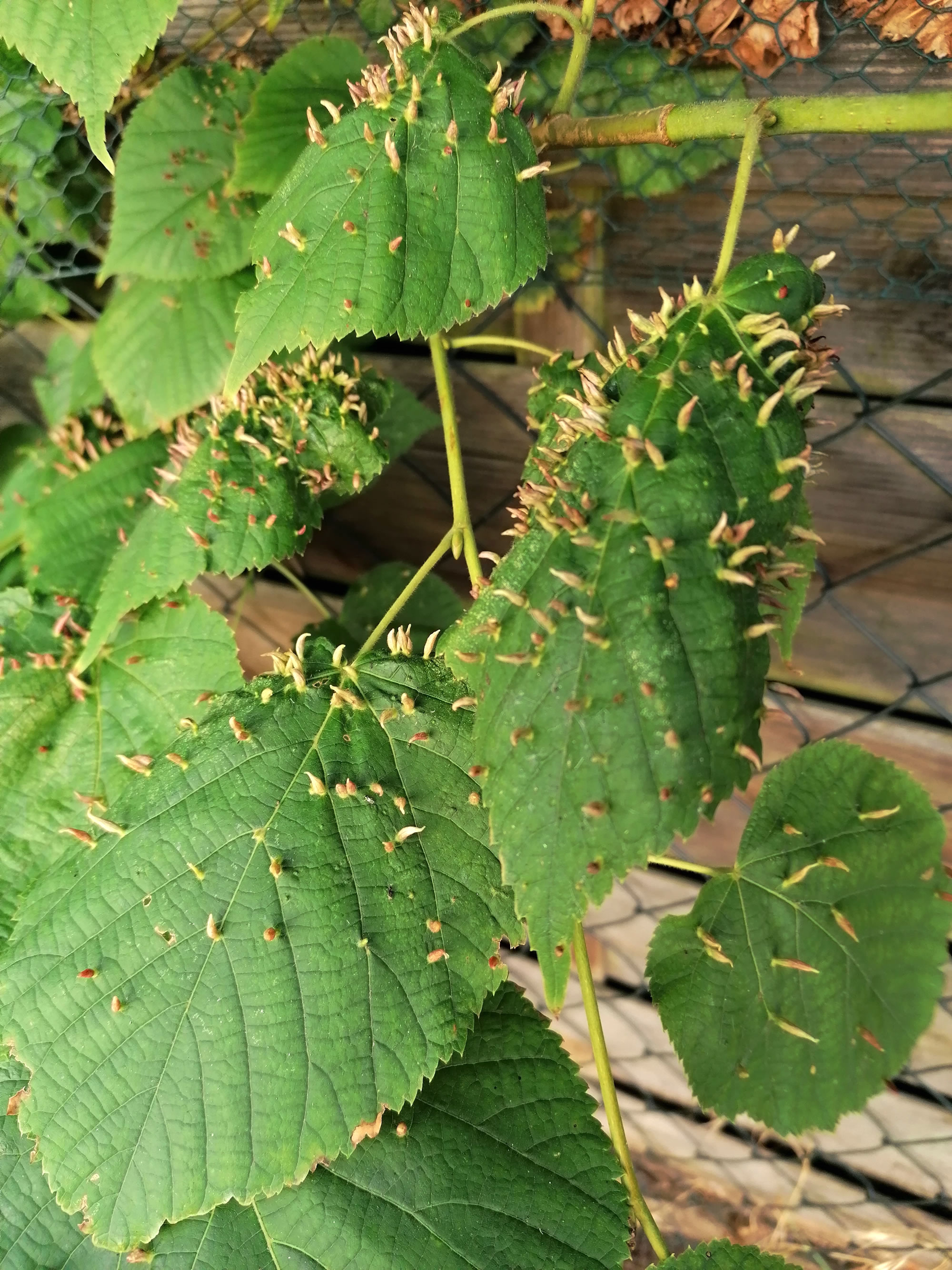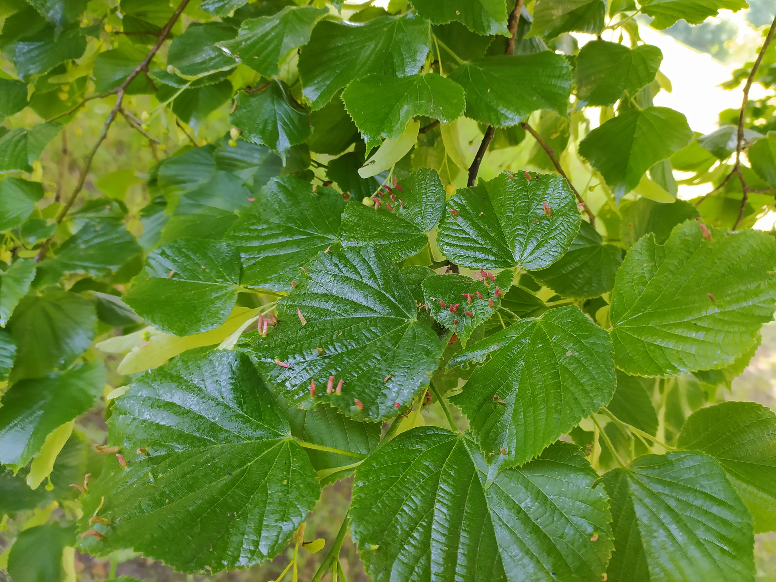 Toeerst hebb ik dacht, wat dat lütt Worms sünd, de sik op de Linnenblääd sett hebbt. Avers dat is de Lindengallmilbe (Eriophyes tiliae). De Plant süht twaars nich so schöön ut, avers se geiht nich dorvun kaputt. De Deerten befind sick in de Gallen so warrt de "Stickels" nöömt, de op de Linnenbläder in de Hööcht staht. De Gallmilben sünd bloots 0,1 bet 0,2 mm lang un 20-50 µm (also 0,02 - 0,05 mm) breit. Se hebbt jüst 4 Beens, tellt avers as all Milben to de Spinndeerten. Se sluupt na 2 bet 3 Weken ut de Gallen un laat sik vun'n Wind wiederdragen na de neegste Linn lütt noog sünd se ja. De Biller köönt Se per Klick