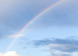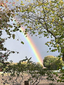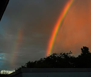 Na en avendlich Gewitter bi deep stahn Sünn wies sik gistern een vun de intensivsten Regenbagens, de ik sehn heff. Knipst heff ik em dör de Schiev. De twete Bagen is ok good to kennen (in't Foto links). De Regen driev noch in fiene Wulken in den helleren Ruum in't Bagenbinnere. En Bagen, de sik sehn laten kann, meen ik. Dat Bild köönt