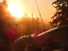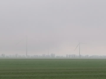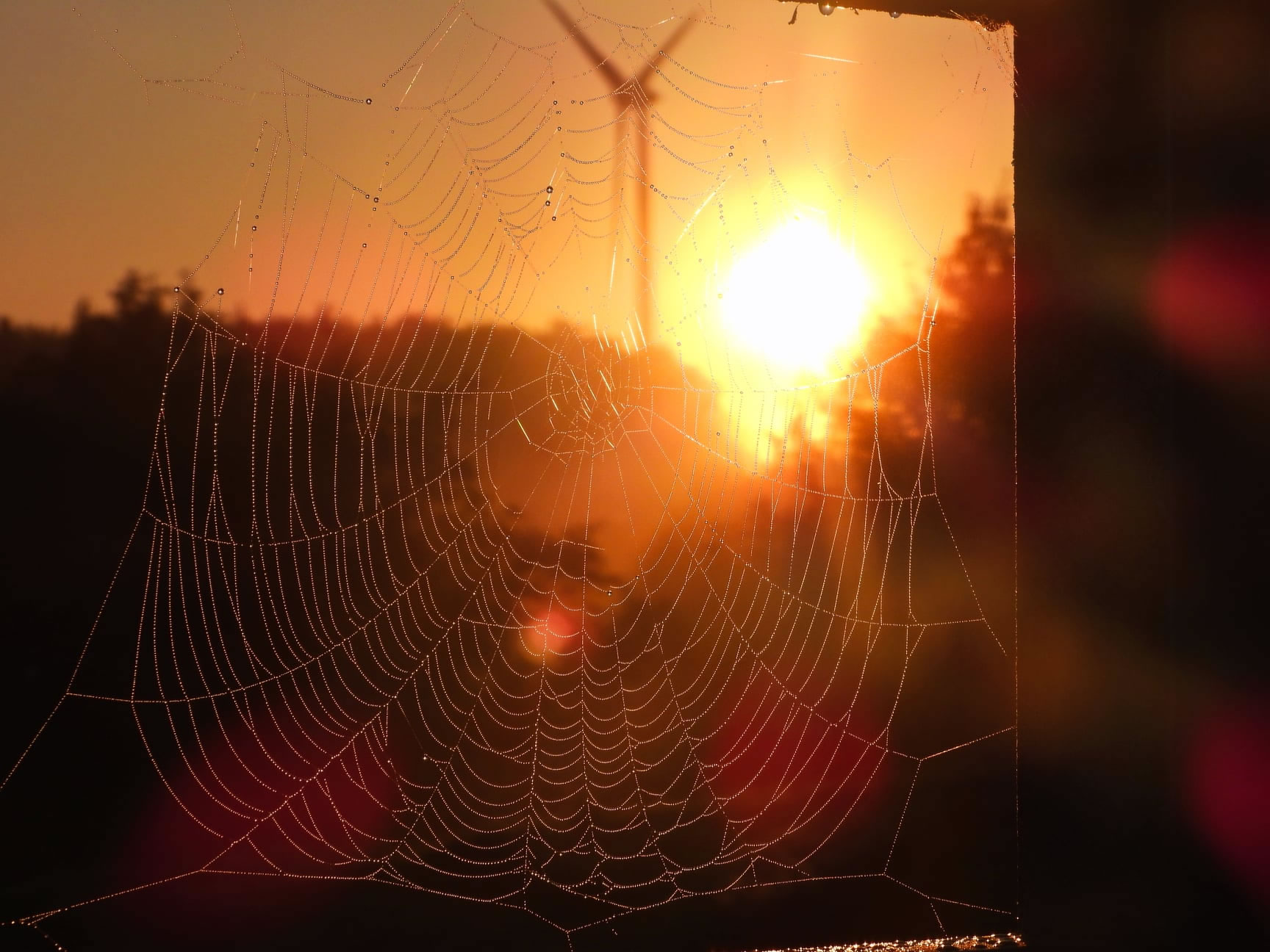 De Sünn un dat Windrad seht beid ut, as wulln se hooch opstiegen. De Harvstnevel licht sik. Dat grote Radnett vun de Krüüzspinn hett den Nevel infungen un glinstert in de eerste Sünn. So warrt se nich veel Büüt fangen, dat Nett is to good to sehn!