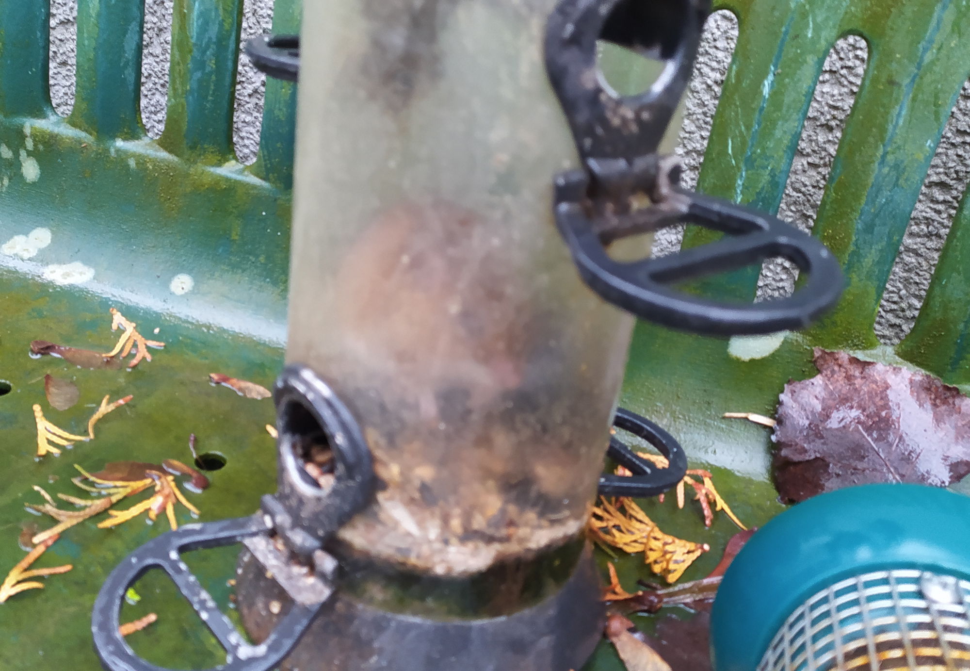Hüüt wull ik nafüllen, de grote Röhr sehg meist lerrig un togliek teemlich schietig ut. Hm, is ja ok Schietweder, mal kieken. Nanu, is de gor nich lerrig? Dat Plastik schient vun binnen beslaan. Dor beweegt sik wat! Is en hungrige Lünk etwa dör en Foderlock sluppt? Dor passt de doch gor nich rin?! Ik mutt baven den Deckel opmaken.