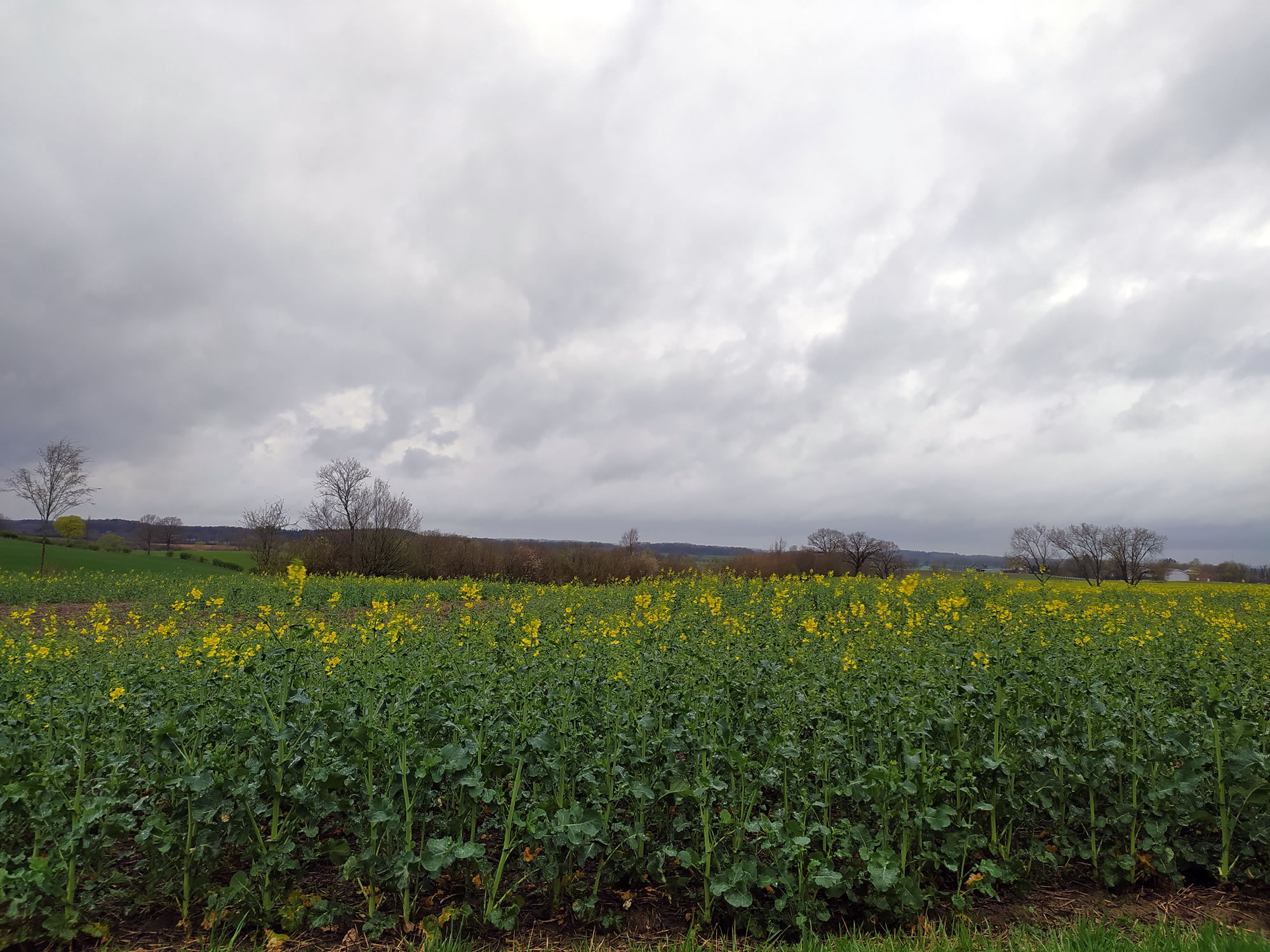 Kiek an, dor is doch wohraftig al en gele Schemer op den Raps! De eersten kiebigen Rapsblöden sünd dor un kiekt sik mal de Welt an. Un de Welt is sünnig avers dröög. Över den Raps gaukelt de eersten Bottervagels, hooch baven dreiht de Gavelsteert sien Krinken, de Milan man de Grund is hart un knökern, un wenn dat nich bald regen deit, hebbt de Raps un de Deerten keen godes Leven. Dat Bild köönt Se per Klick vergröttern! Marlou Lessing |