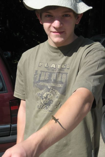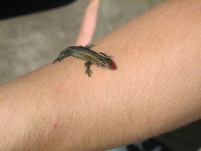 Hett Antje Hessler nich kortens vertellt, dat bi ehr an de Huuswand ein Poch leevt? so dach ik un luur so 'n beten an mien Huuswand rup. Un dor kunnst di ja meist verjagen dor seet in dat Wienloof an de Wand en lütt Draken, ene Echse, nee, ene Eidechse.