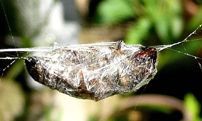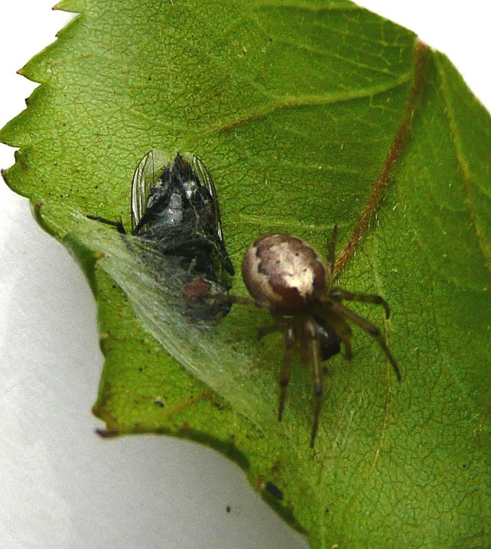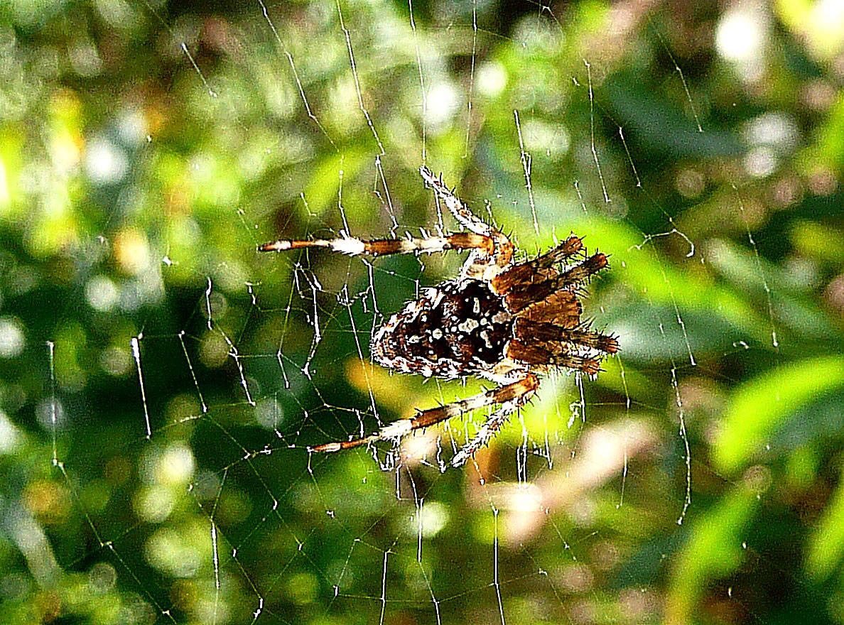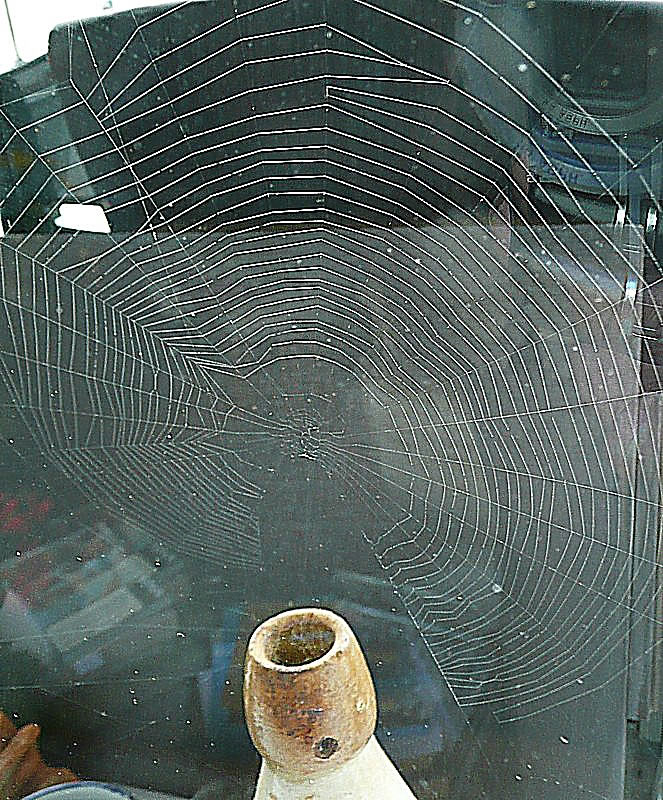 "Kiek mal, wi hebbt en smuck Fensternett kregen", meen mien Mann. He wies up en fien Nett buten in de en Eck vun uns Stubenfenster. In de Meern vun dat Nett seet en lütt Spinn. As ik de Terrassendöör upmöök, suus de Spinn in de Buddel, de buten up dat Fensterbrett ünner dat Nett stünn. Wi harrn de Spinn bi ehr Arbeit stöört, se harr dat Nett noch gor nich ganz fardig, en Utschnitt fehlt noch. Annern Dag seet se wedder in de Meern vun ehr Nett. Ik harr Glück, ik kunn de lütt Spinn dörch de Schiev knipsen. En Krüüzspinn weer dat nich, se harr en ganz anner Muster up den Rüüch. Dat weer en Sektorenspinn.