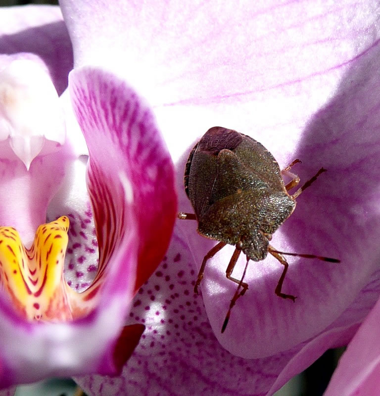 De Wanz höört to de grönen Boomwanzen, se warrt ok "Fule Greet" nöömt. Se harr al ehr bruun Harvstfarv annahmen. Eerst in't Fröhjohr na den Winterslaap is se wedder gröön. Dörch de brune Farv is se in dat bunte Loof kuum uttomaken. Denn egentlich överwintert se in dröges Loof. Ganz selten kümmt se in de Wahnungen. Up mien zartlila Orchideenblööt bin ik se furts wies worrn. Dor harr se sik enen annern Placken utsöken müsst! De Biller köönt Se per Klick