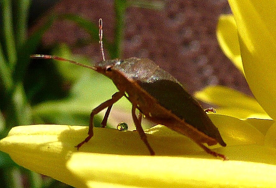 2.11.08 ..Besöök vun de Fule Greet Dat sall man doch nich för möglich hollen. Nu harr en Wanz sik doch al en vun mien Orchideen as Winterquarteer utsöcht! Ik tru mien Ogen nich, aver dat güng mi doch to wiet. Se harr sik enen fienen Placken achter den Blödenkelch utsöcht. Se sleep noch, as ik se wies wöör. Ik heff se denn eenfach mit de Orchidee in de Sünn stellt. Vun de Warms wöör se wedder munter un krabbel nu up de Blööt rüm. Balangseer up den Rand vun de Blööt, dat ik dat al mit de Angst kreeg, se fallt mi up den Footbodden hindaal. Ganz vörsichtig heff ik se denn lever na buten bröcht un in enen Asternstruuß afsett. De stünn up de Terrass in de Sünn. Nu kreeg de lütt Wanz dat mit de Angst to doon. Se leet vör Upregen enen Druppen vun ehr Sekret up de Asternblööt fallen. De glänz as en Parl in Sünnenschien!