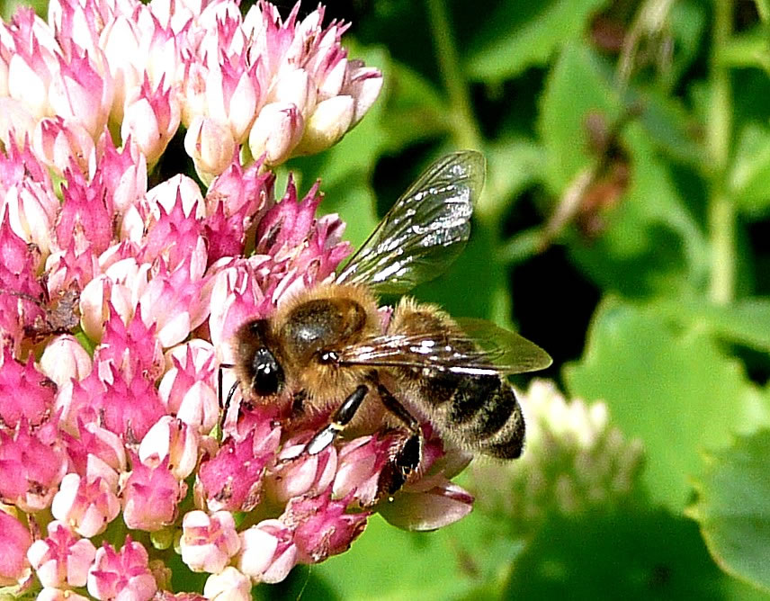 De lütten Naschkatten, de Eerdimmen, besöökt ok in Harvst noch ümmer ievrig de Blomen in unsen Goorn. De hoge Fetthehn, ok Harvstfreud nöömt, mit ehr rosa Blöden hebbt ehr dat andahn. Dor sitt mitünner söss Immen to glieke Tiet. Is nix mehr to halen, fleegt se een Bloom wieder.